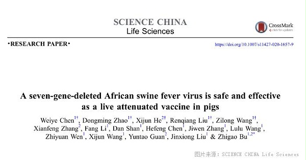 哈兽研在SCIENCE CHINA Life Sciences(《中国科学: 生命科学》(英文版))发表了题为”A seven-gene-deleted African swine fever virus is safe and effective as a live attenuated vaccine in pigs”的研究论文,报道了一株人工缺失7个基因的非洲猪瘟弱毒活疫苗,经系统实验室研究评价,该疫苗对家猪具有良好的安全性和有效性。
